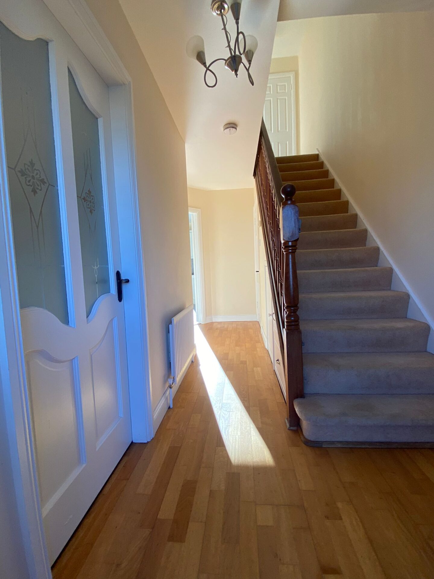This hallway benefits from understairs storage that is complete with light fitting’s, a radiator and electrical sockets. The stairs have a neutral carpet.