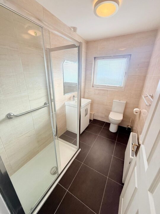 Main Bathroom – Modern bathroom with three piece suite including a double walk in shower unit with electric shower. Tiled extensively with wash hand basin, storage underneath & vanity mirror.