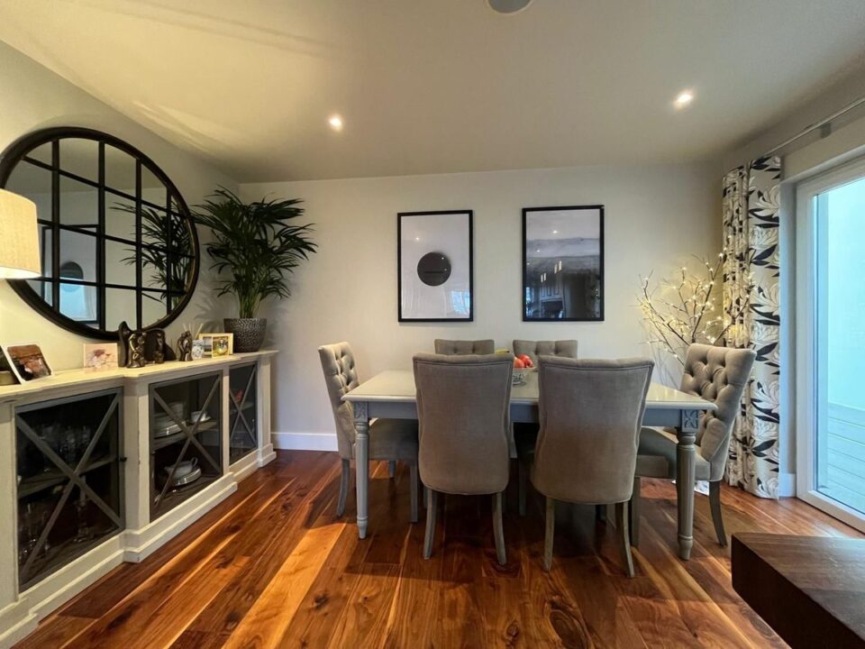 Extending to approximately 135 sq. m., this generously proportioned property offers bright, well-designed accommodation ideal for modern family living. The ground floor comprises a welcoming entrance hall with solid walnut flooring, a stylish and spacious kitchen/dining room, utility room, guest WC, and a beautifully proportioned living room complete with a wood-burning stove. French doors from the living room open onto a private, south-facing rear garden, flooding the space with natural light.