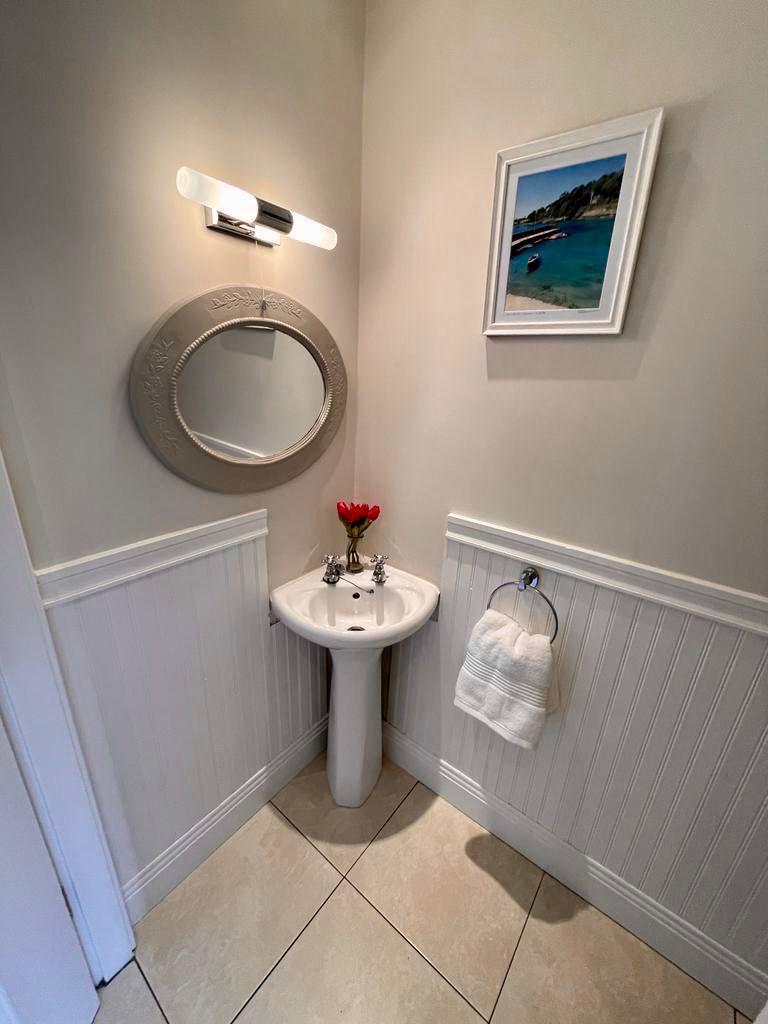Guest wc : Tiled floor, panelling on wall, wc & whb , vanity light.