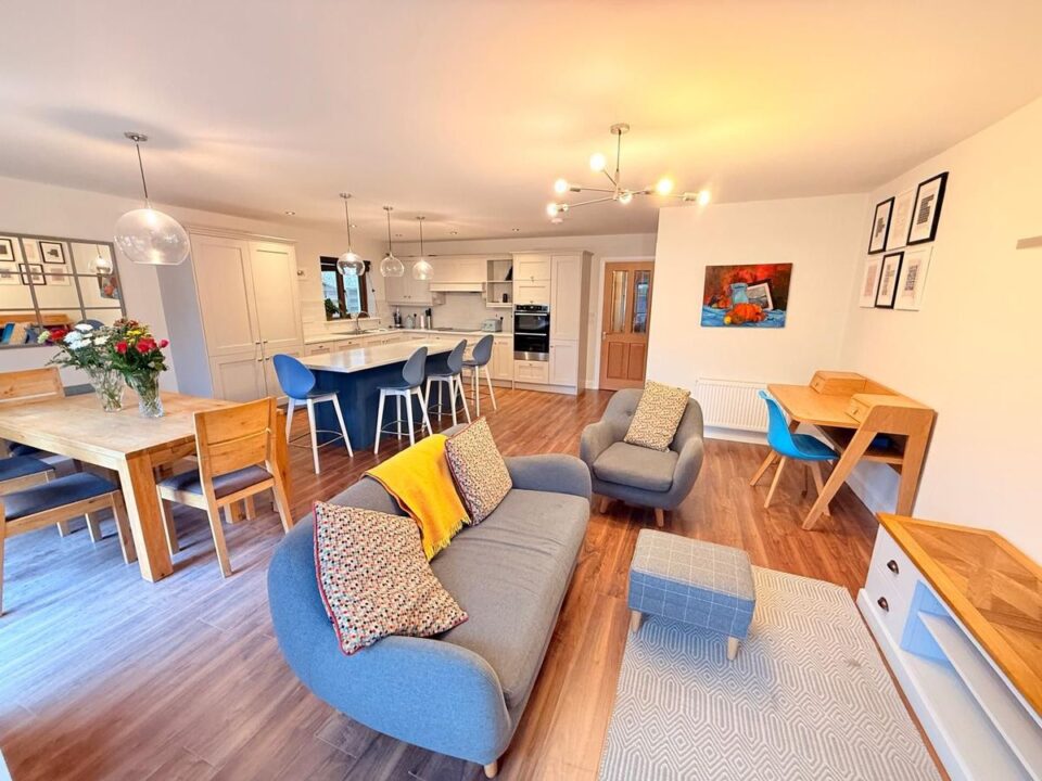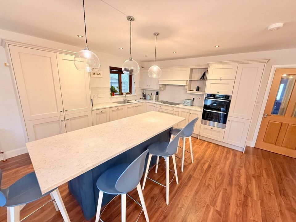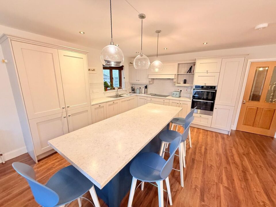 Spacious open plan kitchen/dining room with laminate timber flooring, floor and eye level kitchen units, over the counter subway tiles, integrated sink and drainer, oven, hob and double fridge freezer. The kitchen island has storage and seat There are double French doors to the patio and south facing back garden