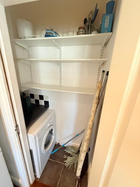 With shelving and plumbing for a washing machine.