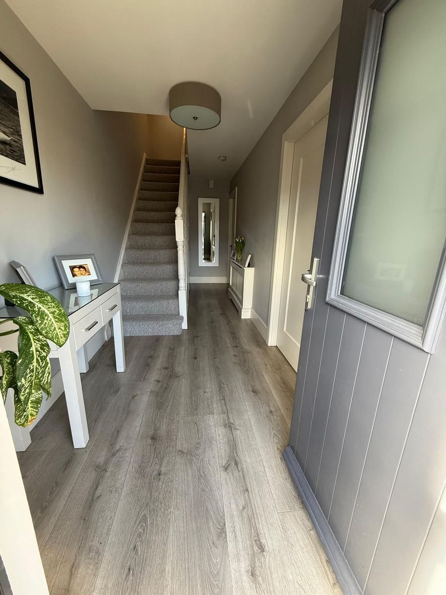 A modern, stylish composite door with centre piece glass panelling leads into the entrance hallway. The entrance hallway comprises of laminate flooring. There is understairs storage.
