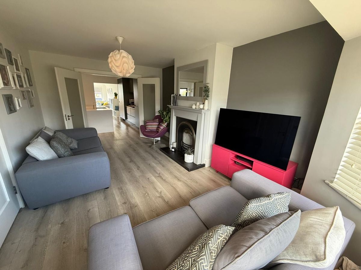This light filled L shaped room has laminate flooring, large patio door and full length windows overlooking the rear garden