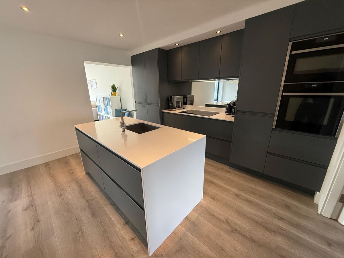 This kitchen has laminate flooring and boasts a high end modern kitchen with all Neff kitchen appliances with a feature island unit with sink. The dining area has feature light fitting with window overlooking patio area.