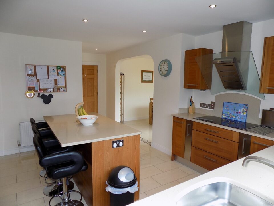 Entrance Hall – Bright entrance hall with solid oak floor and recess lighting. Study – 2.8m x 2.7m Solid oak flooring with window overlooking front of property, blinds. Living Room – 5.9m x 3.4m Solid oak flooring with large bay window overlooking front of property. Feature fireplace with solid-fuel burning stove. Guest WC – WC & WHB with tiled flooring. Kitchen – 6.0m x 4.3m Tiled flooring, luxurious fully fitted kitchen integrated Miele, extractor, hob, oven, steam oven, plate warmer, full length fridge, full length freezer and Electrolux dishwasher, stainless steel sink. There is also a delightful centre piece island unit with ample storage and granite work top. Dining Room – 3.6m x 3.5m Tiled flooring and has French doors leading to the rear garden. Utility Room – Tiled flooring, fully fitted units, stainless steel sink & drainer plumbed for washing machine. Storage press – UPSTAIRS – Bedroom 1 – 4.8m x 3.1m Large double bedroom to the front of the house with oak flooring and large bay window with blinds overlooking front of property, fitted wardrobes. En-Suite Bathroom – 3 Piece suite with pump-shower with tiled flooring and walls at shower area. Bedroom 2 – 4.6m x 3.2m Double bedroom, oak flooring, fitted wardrobes & blinds & curtains. En-Suite Bathroom: 3 Piece suite with pump-shower with tiled flooring and walls. En-Suite Bathroom – 3 Piece suite with pump-shower with tiled flooring and walls. Bedroom 3 – 3.5m x 3.4m Double bedroom, oak flooring fitted wardrobes, blinds & curtains. Bedroom 4 – 3.7m x 2.2m Oak flooring, blinds & curtains. Bathroom – 4 piece suite & pump shower with tiled flooring and walls. Outside – Cobble lock drive at front of house which provides ample off street parking. Rear garden which is South West facing is lawned and has patio area. Garden shed which is wired, outside tap and sensor security lights.