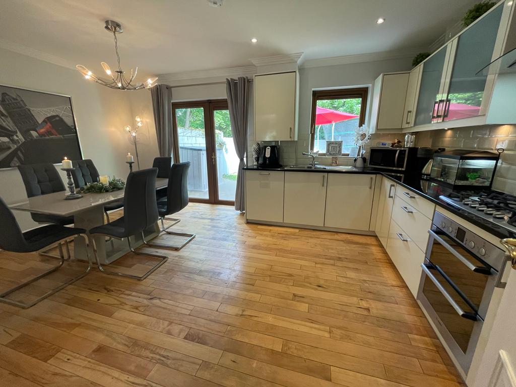 Kitchen/Dining Room: 5.11 m x 3.92 m. Fully fitted high-gloss kitchen units with black granite worktop. Integrated cooker, hob, extractor, sink and dishwasher and washing machine. Timber flooring. Radiator. Access to rear garden via glass door.