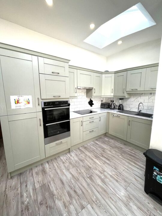 Timber floor. Radiator. Including oven, hob, grill, dishwasher, fridge, & freezer.