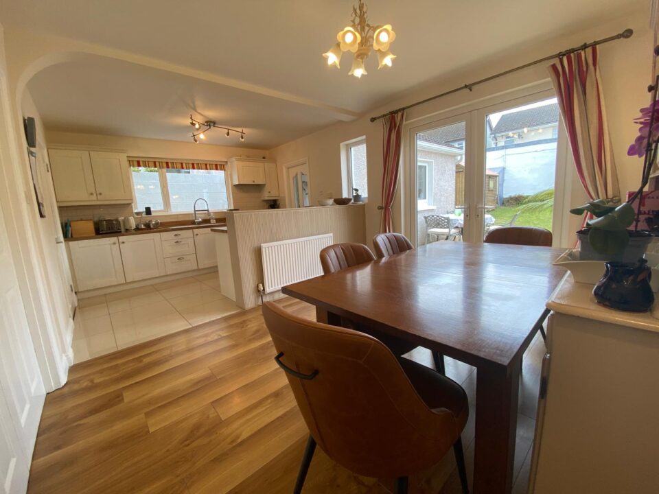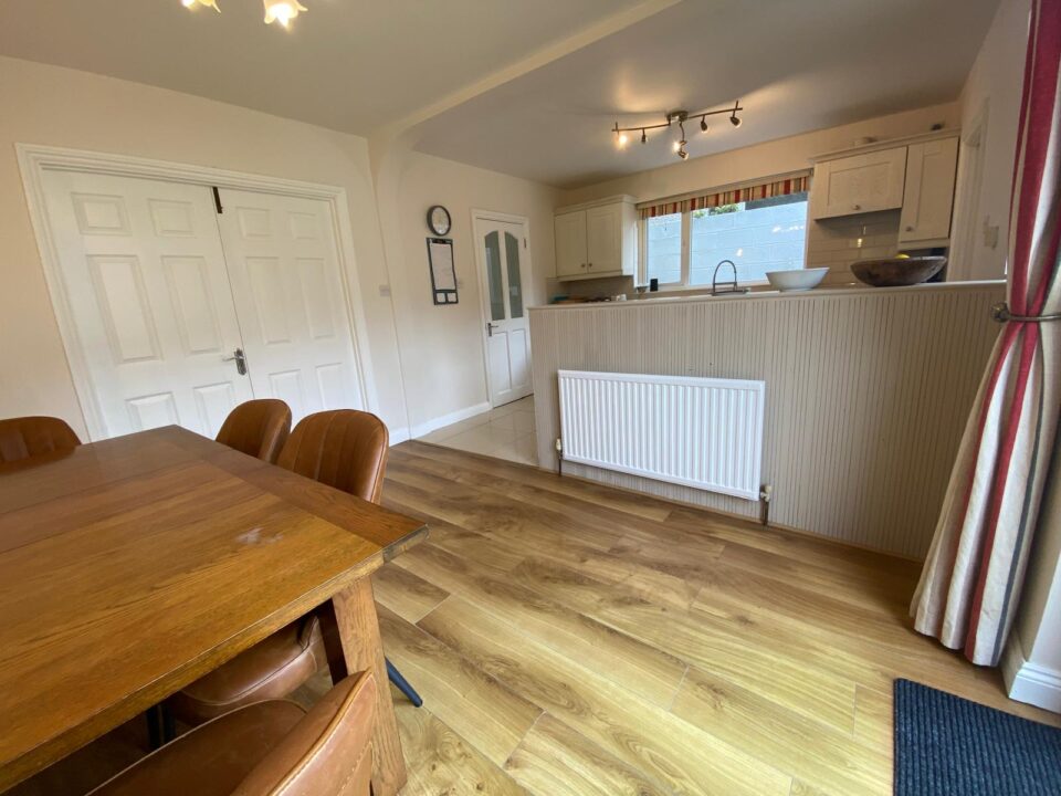 Laminated flooring and tiles. Gas hob. Electric cooker. Breakfast counter. Kitchen table and chairs. Farmhouse dresser. Double doors to living room and west facing rear decking and garden.
