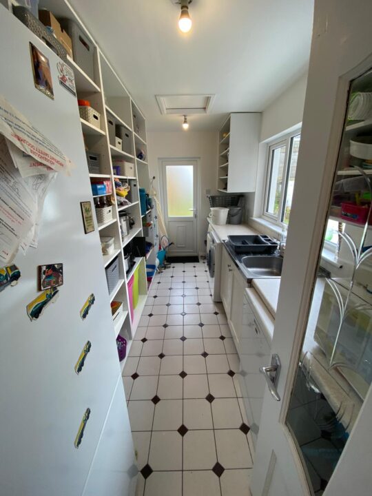 Tiled floor. Storage units. Fridge Freezer. Washing Machine. Dryer. Back door to garden.