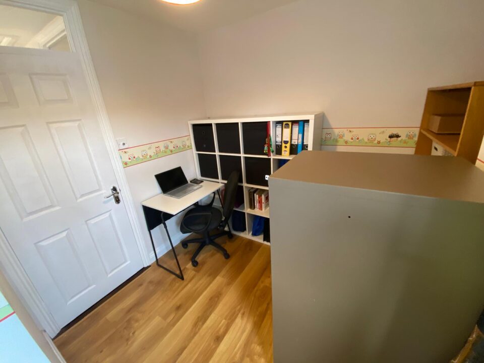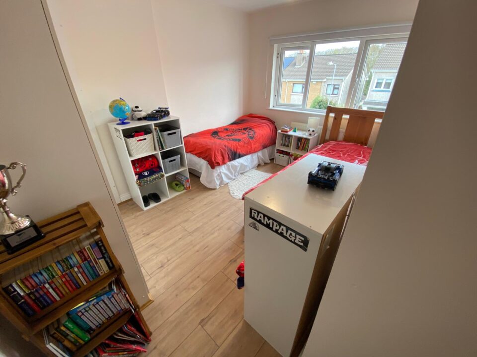 Laminated flooring. Fitted wardrobe. Bedside lockers. Stand alone dressing mirror. Dressing chair, curtains and pole. Ensuite has tiled floor and power shower.