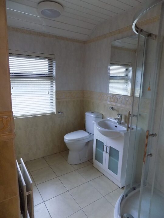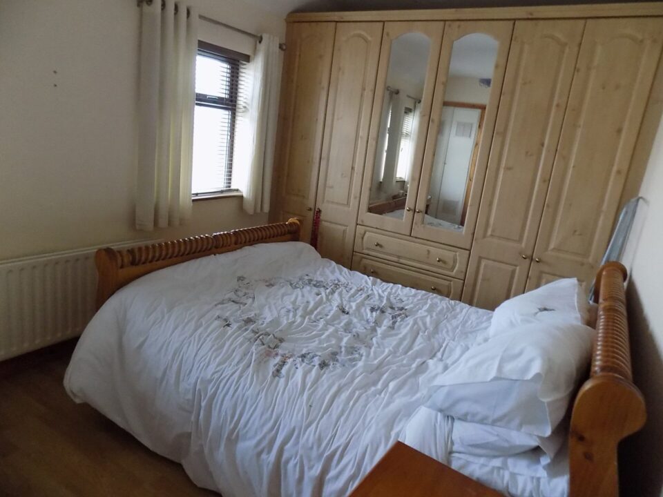 Porch – 1.70m x 1.64m Sliding door. Hallway – Timber floor. Front Room – 3.29m x 4.21m Timber floor with large window, 3-piece suite and coffee table. Living/TV Room – 3.80m x 5.41m Timber flooring with window, featured fireplace with double doors to the kitchen, 3-piece leather suite, coffee table and standing lamp. Kitchen – Tiled floor, fitted units, gas cooking, washer dryer, microwave, enhanced by 2 windows which makes the kitchen bright and airy. WC – Tiled downstairs WC. Stairs & Landing – Carpeted. Bedroom 1 – 2.69m x 4.16m Timber flooring, double bed, fitted wardrobes, bed side lockers and dresser. Bedroom 2 – 4.17m x 3.77m Timber flooring, double bed, fitted wardrobes, bed side lockers, storage unit. Bathroom – 2.57m x 2.14m Fully tiled with electric shower.