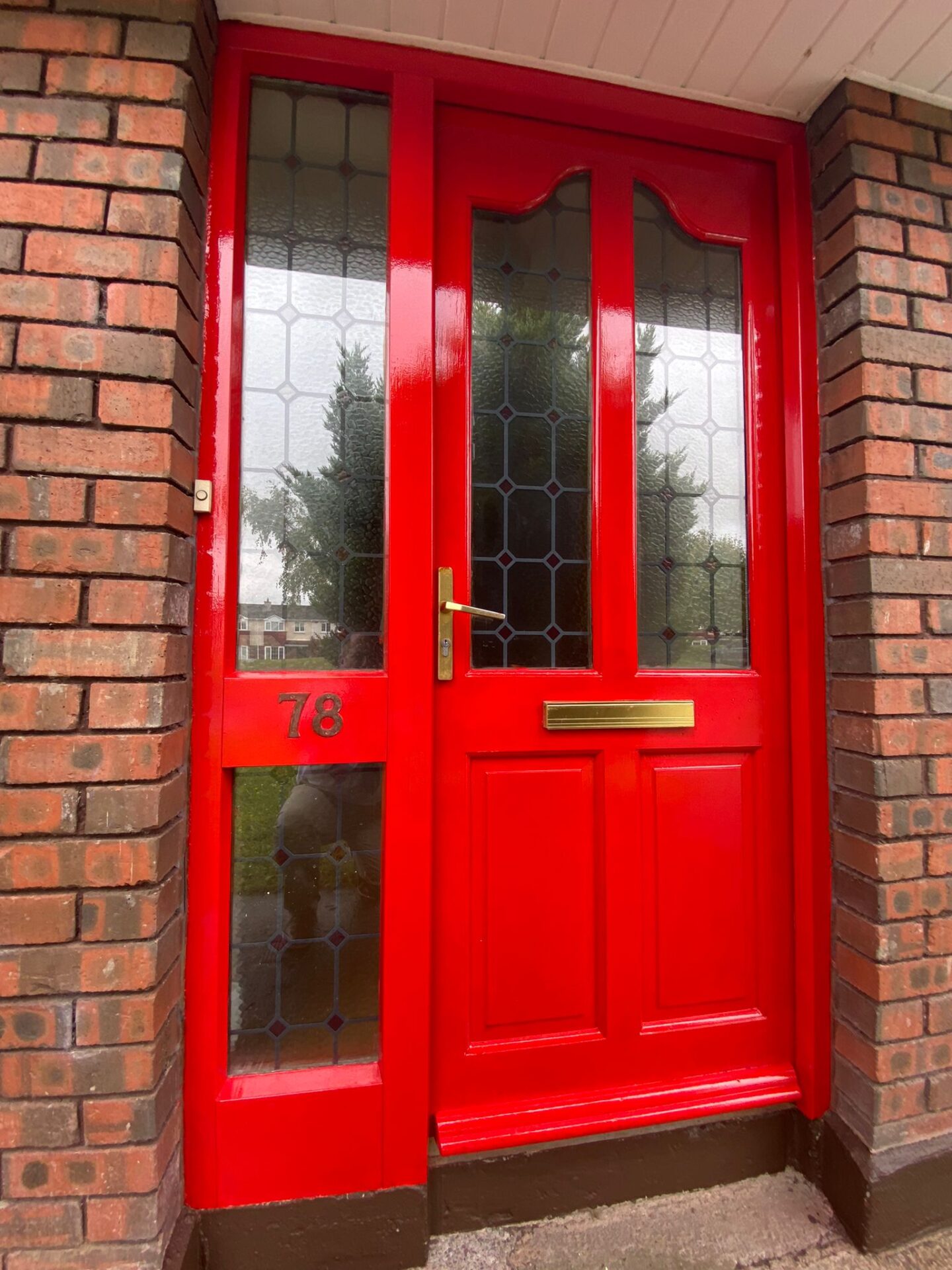 Entrance Hallway 4.51m x 1.87m Ceramic tile floor, carpet stairway, teak hardwood front door with side glazed panel, centre light.