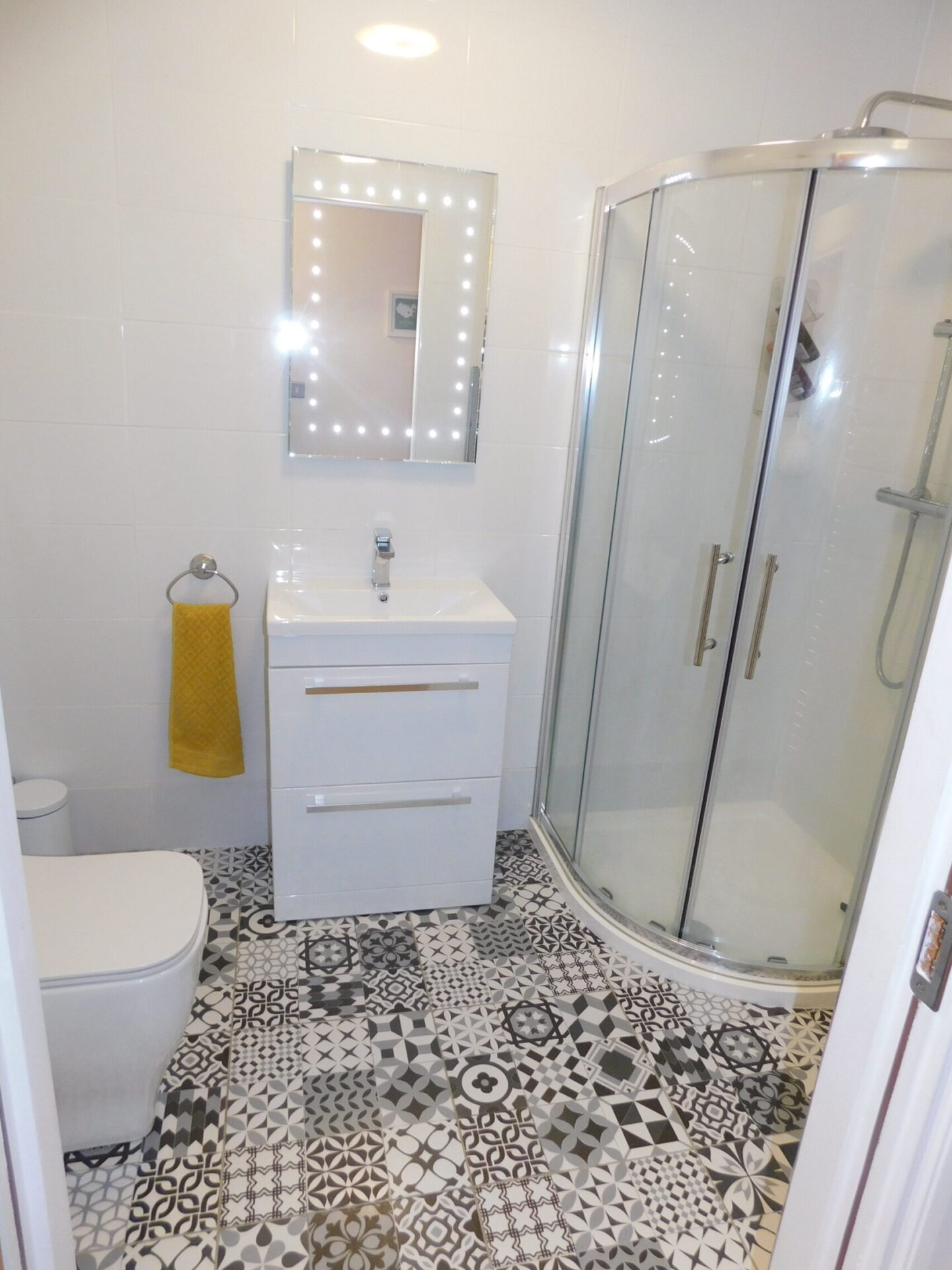 Main bathroom, newly renovated with new floor and wall tiles, wc, whb with built in vanity unit and a rain water over head walk in shower.