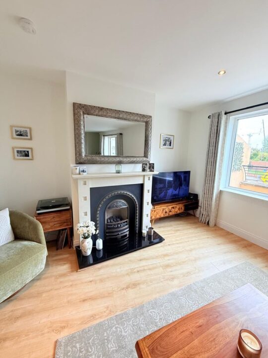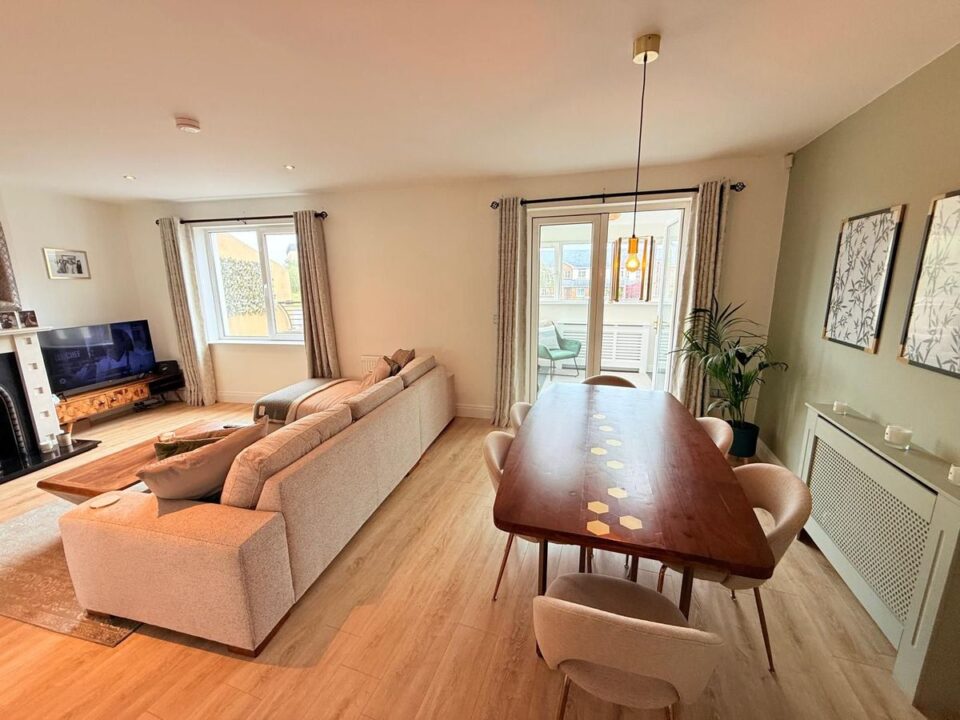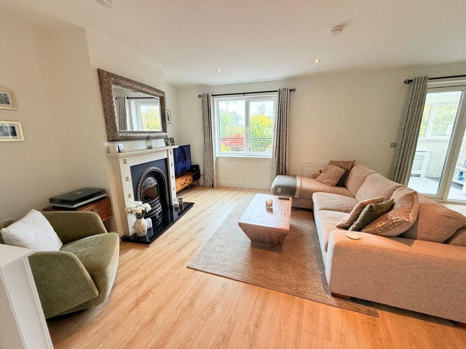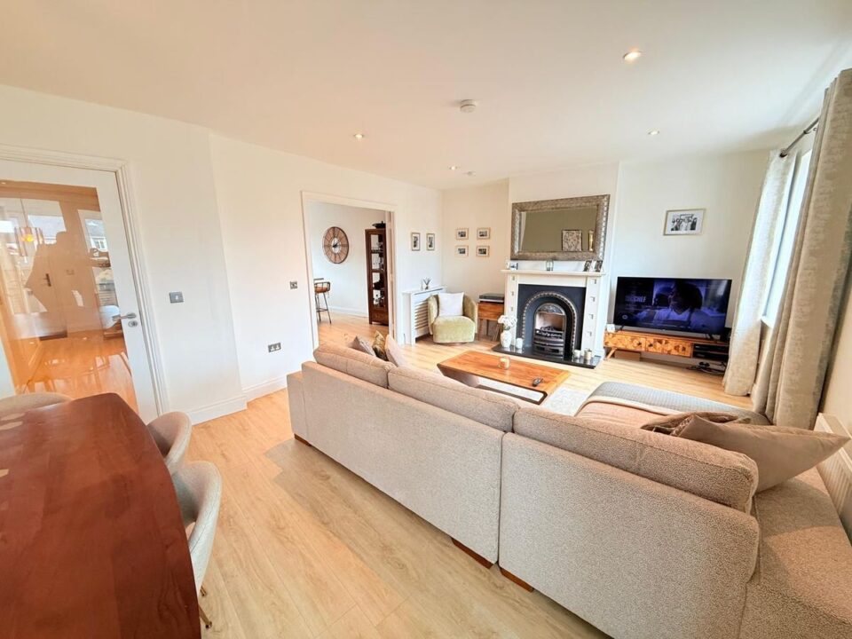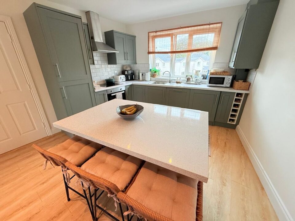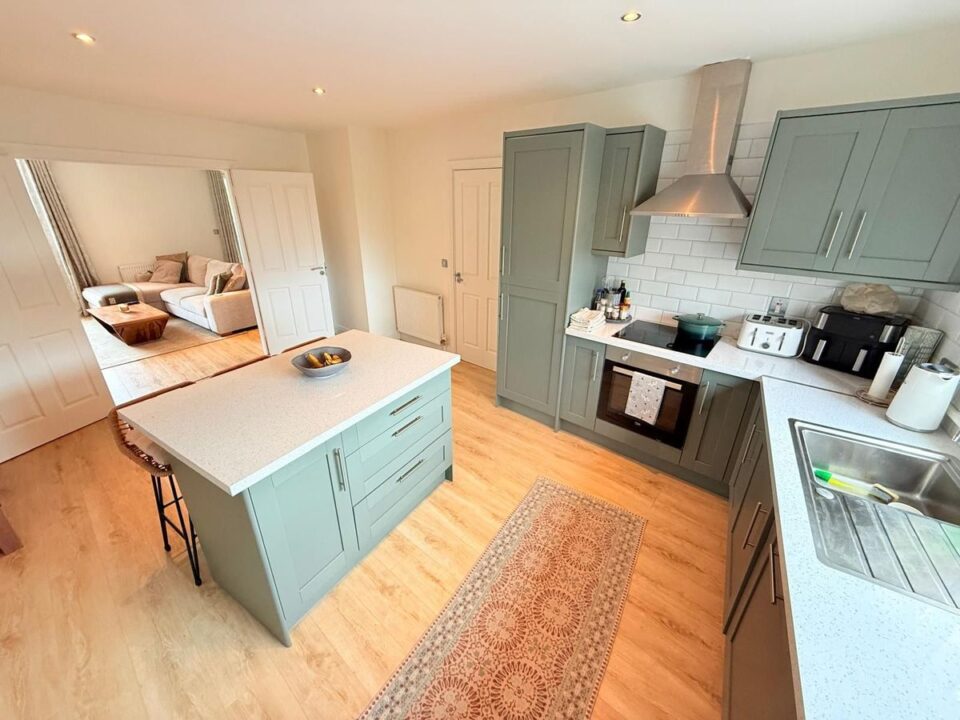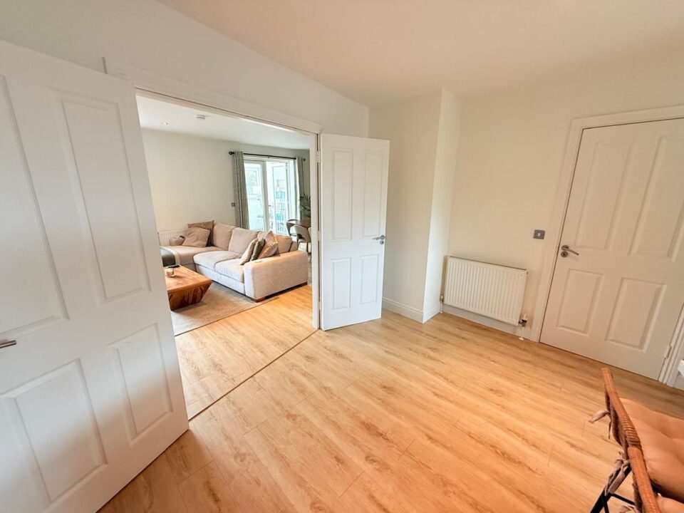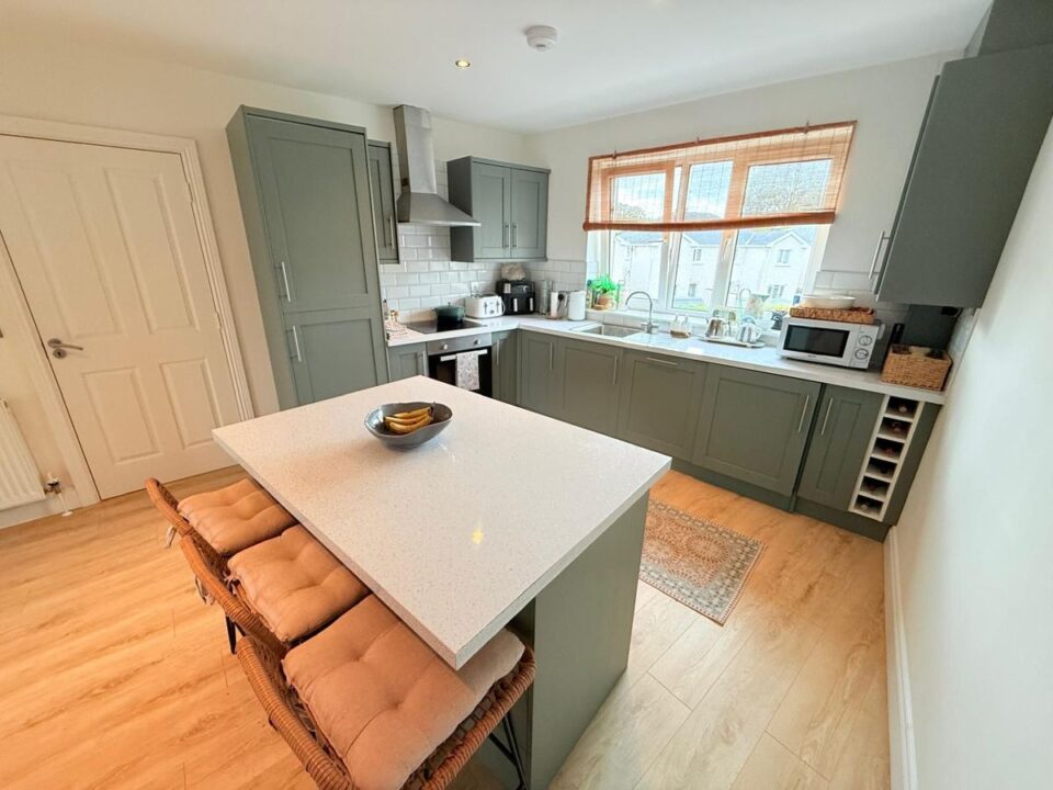 Fully fitted kitchen with integrated fridge freezer, electric hob , oven and extractor fan, integrated dishwasher. The feature island unit includes the three stools. A beautiful laminate flooring runs through to the living room.