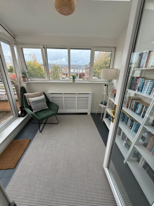 A bright, versatile space with lovely views, tiled flooring, Velux windows, and access to the balcony.