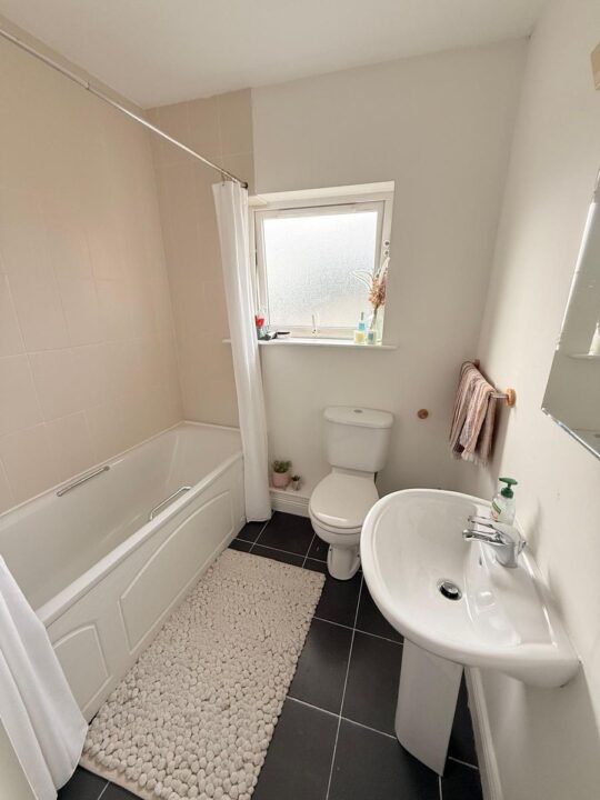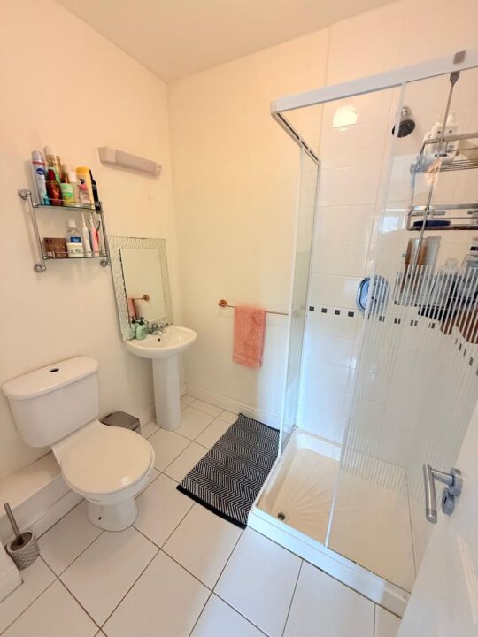 Includes corner shower with mains shower, tiled floor and wall in shower