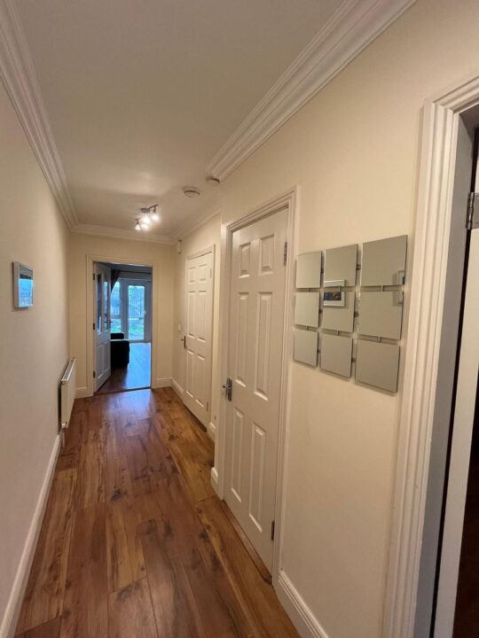You enter via a long hallway. On the right hand side you have a large double bedroom with built in wardrobes, with radiator and timber flooring.