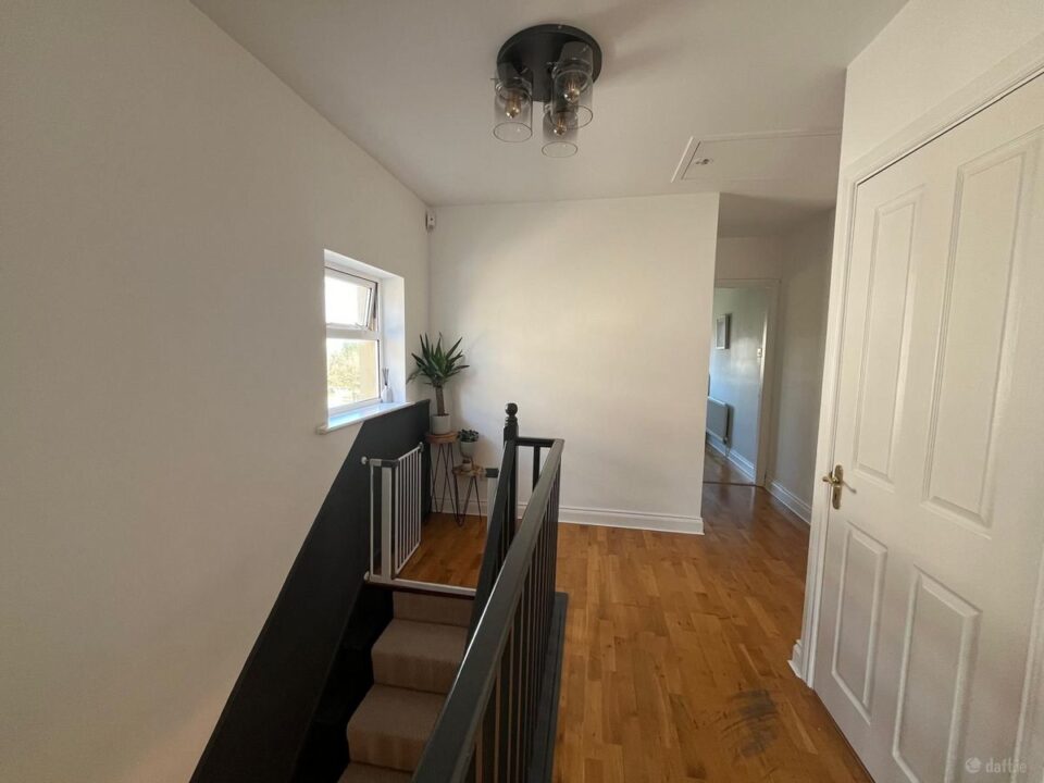 The elegant staircase and landing are finished with high-quality timber flooring, with the staircase fully renovated in 2023. The landing provides convenient access to power points, the hot-press, and the attic via Stira stairs. A side-facing window ensures the space is filled with natural light, enhancing the open and airy feel of this central part of the home.