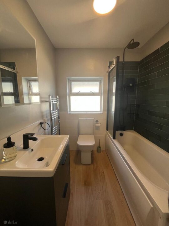 Fully renovated in 2023, this stylish bathroom features a modern three-piece suite, including a standalone electric shower, wash hand basin, and WC. The space has a central ceiling light and a frosted glass window overlooking the side of the property, combining functionality with a clean, contemporary aesthetic.