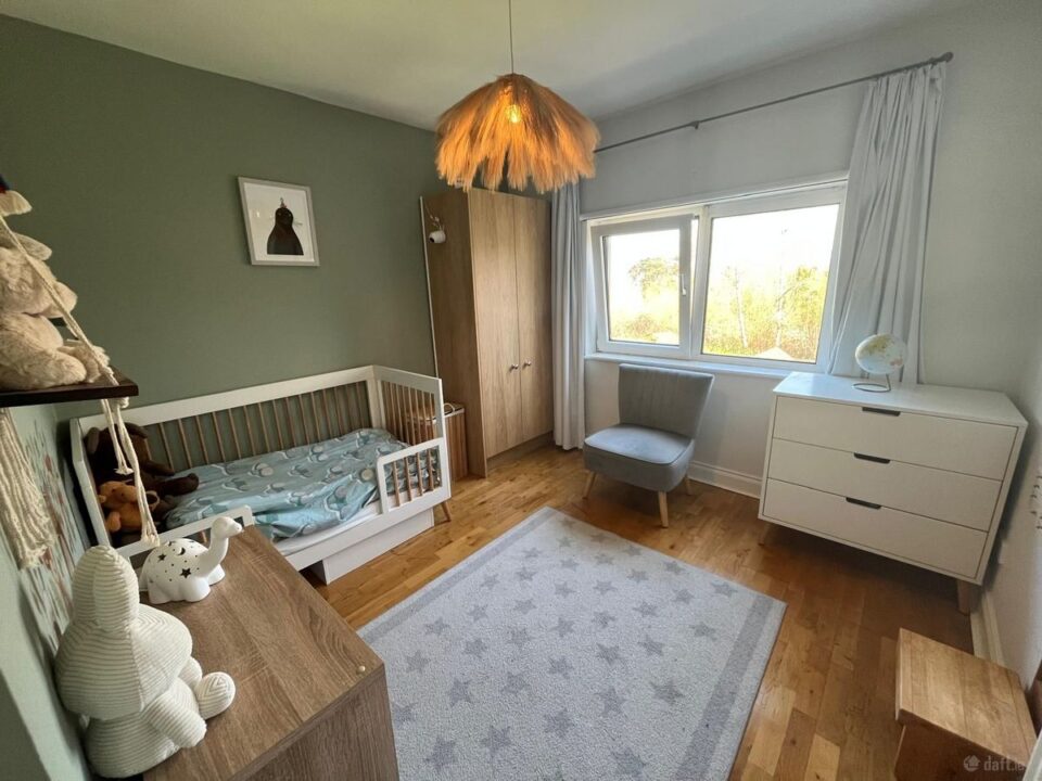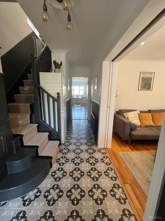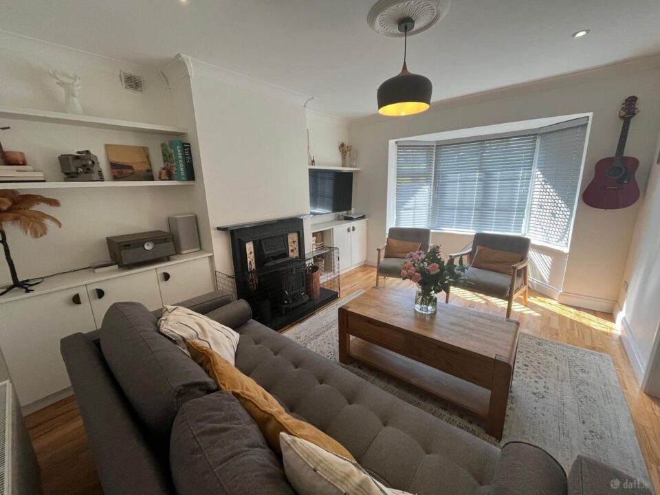 The living room boasts solid timber flooring, recessed lighting, a radiator, and ample power points. A Waterford Stanley multi-fuel stove serves as a focal point, complemented by built-in shelving around the fireplace( done in 2023). A bay window with roller blinds overlooks the front garden, and the room’s south-facing aspect ensures excellent natural light. Renovations completed in 2023 include the installation of a new pocket door and upgraded finishes throughout. A brand-new AMCE Blind has been fitted to the bay window, completing the elegant look.