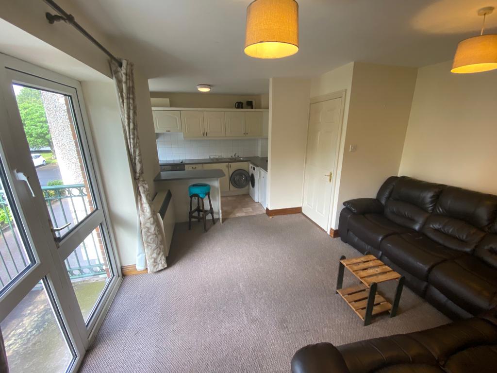 Kitchen/Living Room: 5.7m x 3.2m. Kitchen area with tile flooring, built-in floor and eye level units, over the counter tiles, with fridge-freezer, oven, washing machine/dryer and dishwasher, electric heater and window over looking the development.