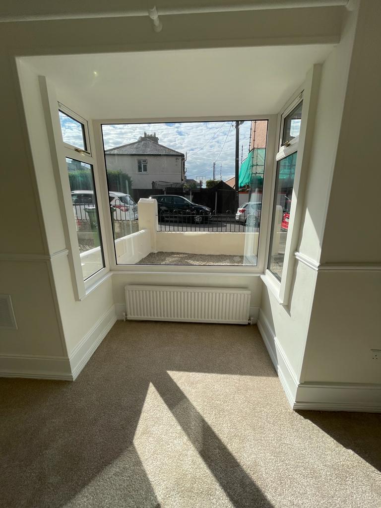 Large bright living room (which was originally two rooms) with windows at both aspects of the house, one of which is a large bay window. Carpet flooring and feature fireplace.