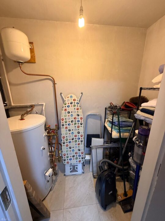 Bathroom: Three piece suite with beautiful tiles. Also a mirror over the sink, wall light, storage press, chrome heated towel rail. Sky light window.