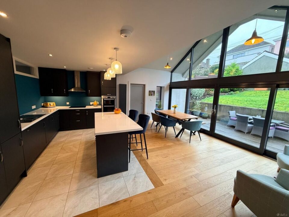 Kitchen /dining room: 6m x 6m. Excellent range of newly fitted kitchen units with feature island. This gorgeous style kitchen also includes hob, double oven, extractor, integrated dishwasher, fridge, freezer. There is feature tiled flooring and all glazed rear façade overlooking rear garden. The dining area has solid oak flooring feature horizontal radiator and a number of feature ligh fittings.