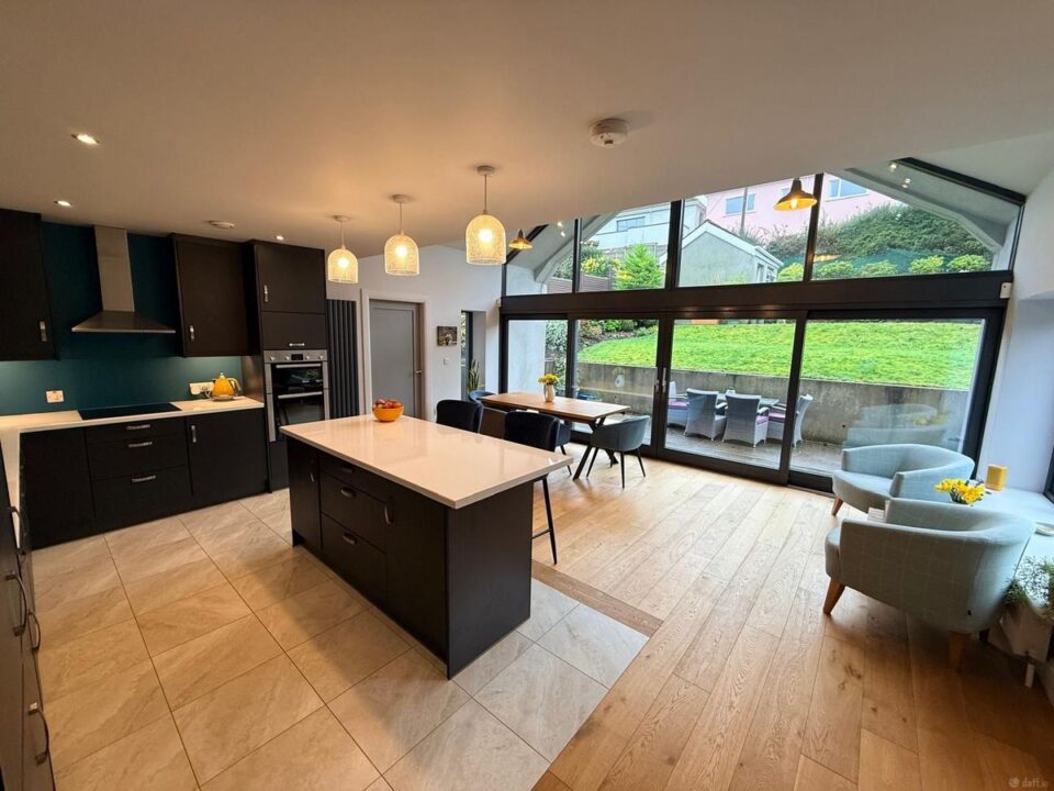 Sitting Room: 4.1m x 3.6 Solid oak flooring, bespoke Glenline fitted units with floating shelving. There is a full length window overlooking rear garden as well as recess lighting. Feature pocket door to kitchen ‘ living room.