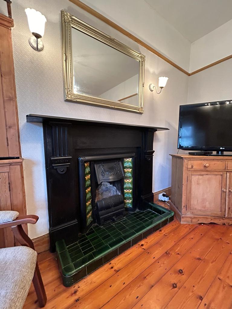 Featured fire place, original flooring, doors leading to the kitchen and Hall.