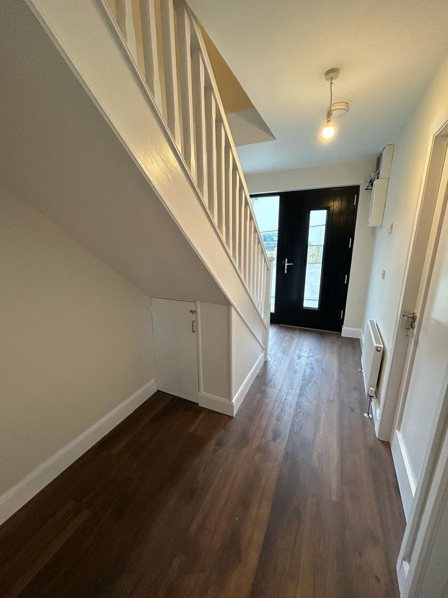 Spacious hallway with timber laminate flooring.