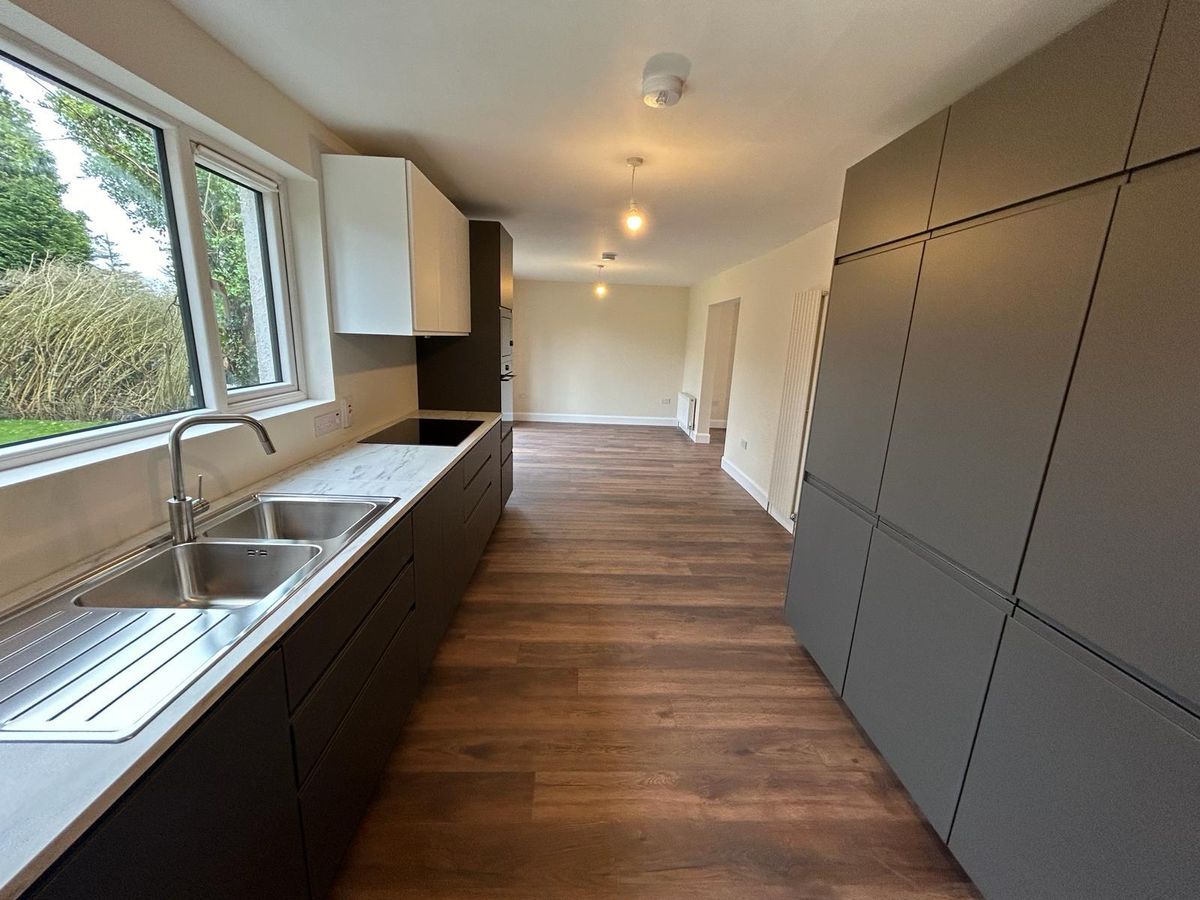 Laminate flooring, new fully fitted kitchen with integrated microwave, oven and hob, fridge /freezer, floor and wall units, double sink and drainer over looking the garden and sliding door to garden and separate door to patio.