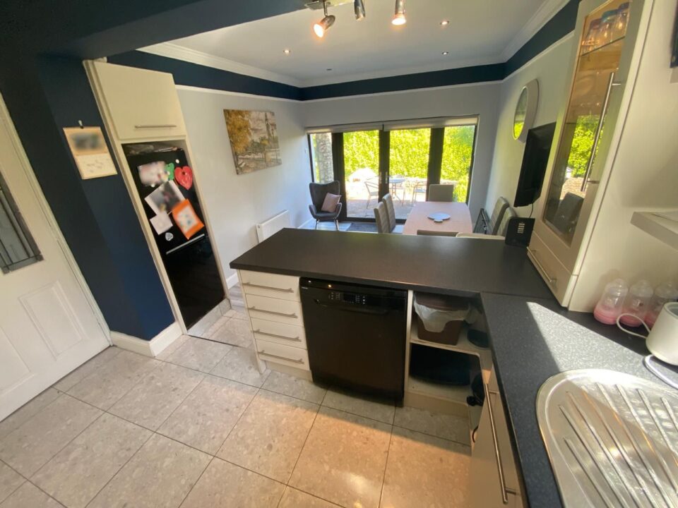 Kitchen flooring is tiled flooring; split level dining has laminated flooring. Fitted kitchen, breakfast bar, electric cooker and hob, dishwasher, washing machine, fridge freezer. Dining area enjoys double French doors to rear garden and patio.