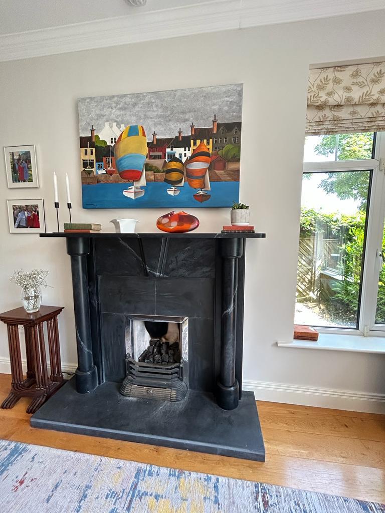 Sitting Room: 7.18m x 4.4m. Solid wood flooring, feature fireplace, dual aspect windows and double doors to hall and another door to kitchen.