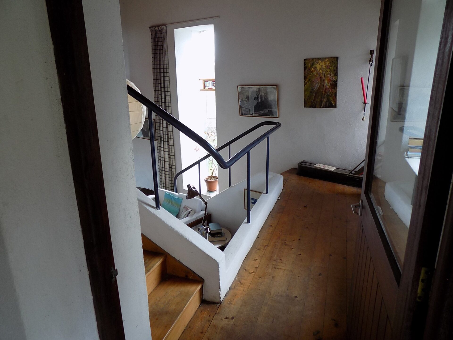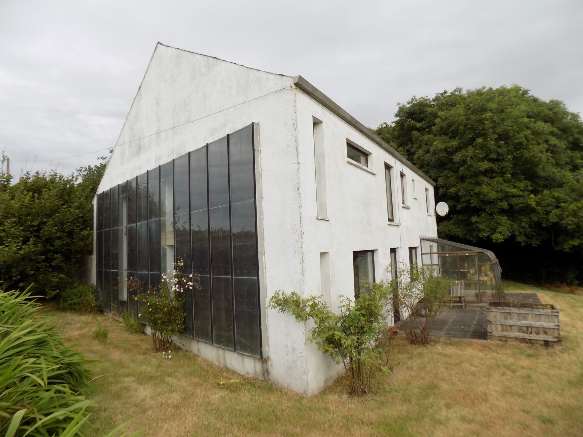 Entrance / Boot Area – 2.65m x 2.03m Tiled Floor. Upper Entrance Area – 4.34m x 1.37m Timber Floor. Stairs down to lounge – 4.17m x 4.2m Double height ceiling 5.08m. Wood burning stove. Featured window 5.08m high. Steps leading to Dining / Kitchen – 11.15m x 4.66m Terracotta Tiles. This area includes utility room, Larder, Aga, storage, Original pine kitchen, Half Door to back garden. Because of the number of large windows this area is wonderfully bright, leading out to patio and secluded back garden. Mezzanine Area – 6.47m x 1.26m Built in Book Shelf. Potential to be converted to a bedroom Bedroom 1 – 5.12m x 4.37m 4 Windows, timber flooring and built in wardrobe. Bedroom 2 – 4.39m x 2.43m Timber flooring, built in wardrobe. Stairs to mezzanine area 3.81m X 1.44m. Family bathroom – 3.38m x 2.3m 3 piece suite. Outside – Solar panels on South Facing Gable Wall. Double Car Port Garden Shed, Slate Tiled Roof. Glasshouse. Secluded Mature Garden on two levels 110m Tree lined drive.