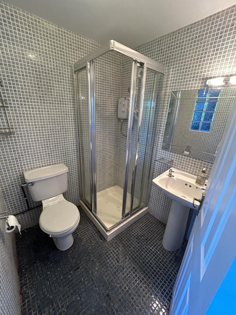 Tiled walls and flooring, with wc, whb, and electric shower.