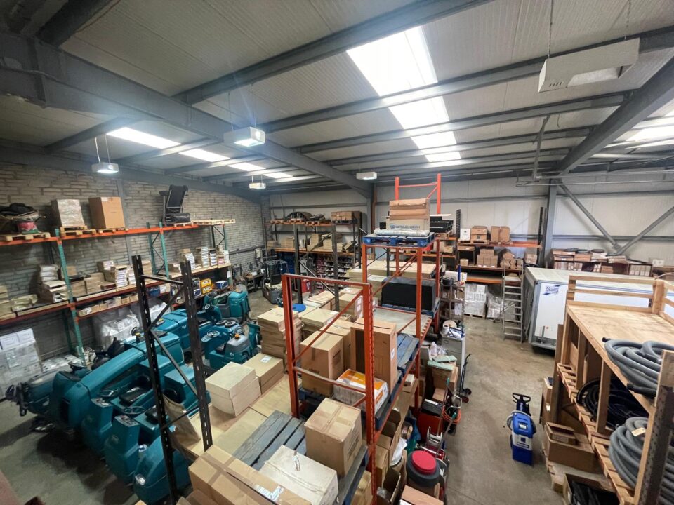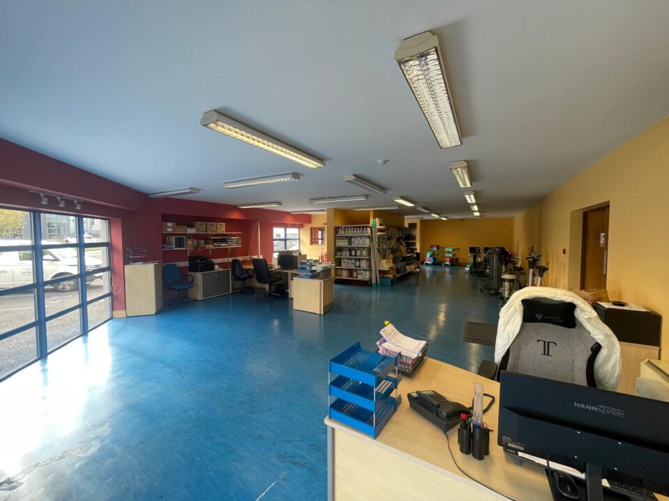 This warehouse was constructed c. 20 years ago and includes 4 parking spaces outside the building. It consists of an open-plan warehouse, showroom area, and toilet on the ground floor, then 4 offices, a board room, canteen, and toilets upstairs.